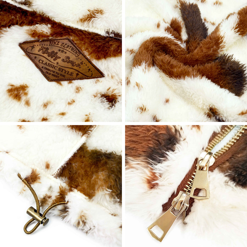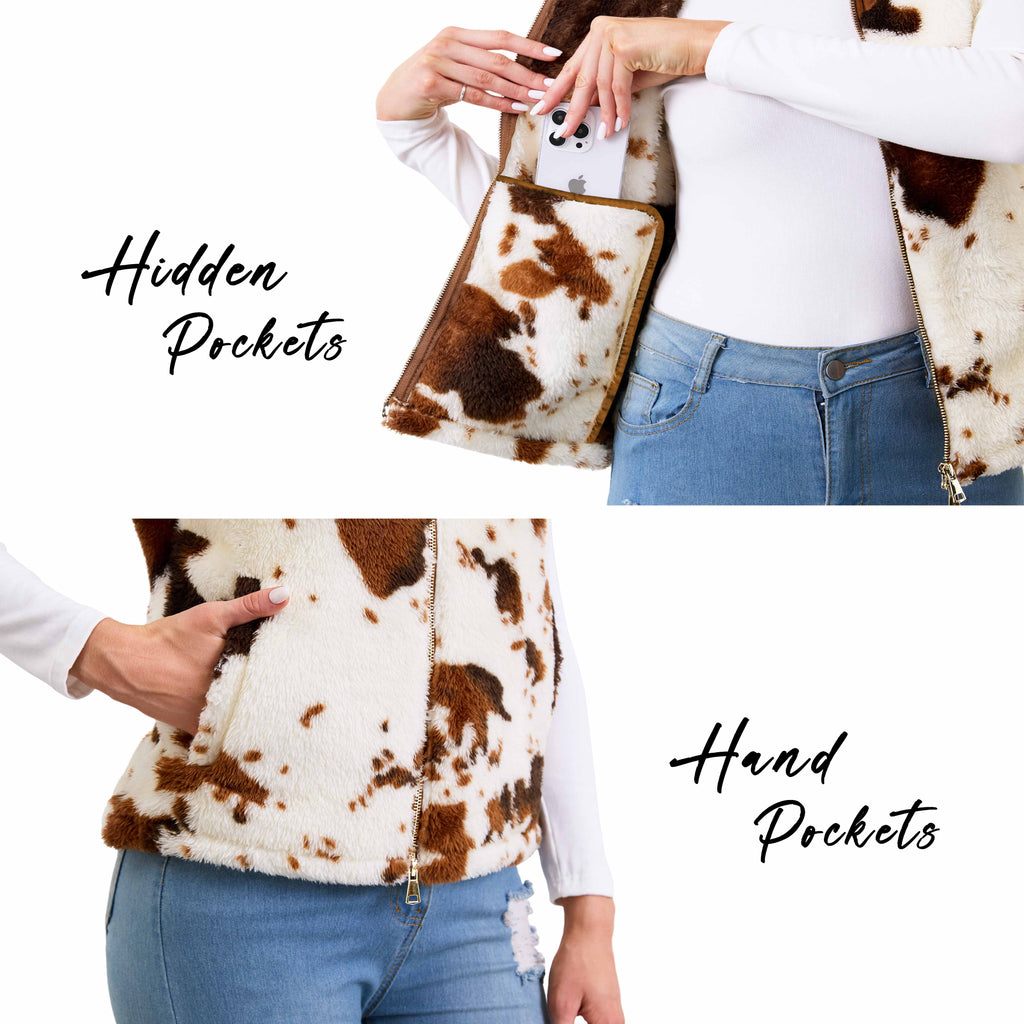 - DESIGN: The mimic cow print pattern adds a bold, rustic aesthetic. This sherpa fleece faux fur vest combines modern functionality with classic Western-inspired design. Perfect for cow print stuff lovers. Casual and cozy to wear, it combines comfort, warmth, and style.